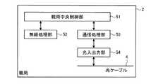 図2は、親局2の構成例を示す図である。図示したように、親局2は、管理サーバ1または子局5とのデータ処理を行う親局中央制御部51と、子局5と無線ネットワーク通信を行うための無線通信制御を行う無線処理部52と、光ケーブル4を介して広域ネットワーク網3へ接続するための光入出力部54および通信処理部53と、を備えている。  FIG. 2 is a diagram illustrating a configuration example of the