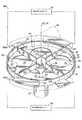 凹部52は、大きなプレート50上であって回転軸54を中心とする均一な半径の周りに配置される。凹部52は回転軸54に対してほぼ等角度の間隔を有する。回転軸54は方位軸40と実質的に同一直線上、すなわち共軸であるが、本発明はそれに限定されない。図2Aにおいて最良の態様が図示されているように、隣接する凹部52は、s-2wrに等しいギャップ間隔だけ隔てられていて良い。ここで、sは隣接する凹部52の中心間距離で、wrは隣接する凹部52の半径である。前方ライン42-処理空間38の雰囲気を排気する-が、大きなプレート50の上であって回転軸54に沿って設けられている。The