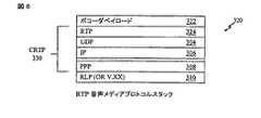 典型的に、図6に示されているように、音声トラフィックは、各UDPデータグラム304を、RTPヘッダ324およびボコーダペイロード322に分割するRTP324を用いて、アプリケーションレイヤにおいてカプセル化される。図7は、UDP音声メディアプロトコルスタック332を示している。音声トラフィックは、典型的に、CRTPヘッダコンプレッション330が用意できないか、あるいはネットメンバーによってサポートされない場合は、自由に、UDPデータグラム304を用いて、RTPカプセル化でなく純粋にカプセル化されるかも知れない。図8は、メディアトラフィックプロトコルスタック334を示している。メディアトラフィックプロトコルスタック334は、アプリケーションレベルRTPカプセル化でないネット参加者のために使用される。データ336は、UDPデータグラム304の中にカプセル化される。 Typically, as shown in FIG. 6, voice traffic is encapsulated at the application