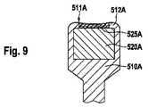 図9は、くぼみ511Aを有する駆動シャフト510Aの上部分を示す別の実施形態の概略図であり、くぼみ511Aは第2の磁気結合要素520Aを収容している。曲がった壁部分512Aは、くぼみ511A内に第2の磁気結合要素を固定している。くぼみ511Aの中に第2の磁気結合要素520Aを導入するのに先立って、壁部分512Aは、くぼみ511Aの中に第2の磁気結合要素520Aを挿入できるように、直線状となっていてもよい。次に、第2の磁気結合要素520Aがくぼみ内に固定されるように、壁部分512Aが、例えば成形スタンプを使用して曲げられてもよい。保護カバー525Aは残りの開口部を被覆してもよく、その結果、第2の磁気結合要素520Aは腐食から保護される。保護カバー525Aは、樹脂であっても、これまでに説明した任意の好適な材料であってもよい。駆動シャフト510Aの上部分が、(磁化可能でない)金属、又は型押しプロセスにて形成され得る低接着性の他の材料から作られる場合、保護層525Aは、摩耗から効果的に保護されており、したがってここでは必ずしも高い耐摩耗性を有する必要はない。  FIG. 9 is a schematic view of another embodiment showing the upper portion of