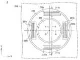一方、上部基板151の内側には円環状のジンバル152が設けられ、さらにジンバル152の内側にミラー153が設けられている。ミラー153の上面には、例えば3層のTi/Pt/Au層(不図示)が形成されている。上部基板151とジンバル152とは、180゜隔てた2か所においてトーションバネ154により連結され、同様にジンバル152とミラー153とは、180゜隔てた2か所においてトーションバネ155により連結されている。一対のトーションバネ154を通るx軸と、一対のトーションバネ155を通るy軸は直交する。結果として、ミラー153は、x軸とy軸の2軸を回動軸として回動することができる。  On the other hand, an