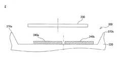 また、突出部8320の外面を含む基部8310の上面には、4つの扇形の電極8340a〜8340dが形成されており、これらの電極8340a〜8340dの周囲には、対向するミラー基板8201の可動枠連結部8211a,8211b及びミラー連結部8221a,8221bに対向する位置に、それぞれ平面視略矩形の凹部8350a〜8350dが形成されている。また、基部8310の上面には、第1〜第3テラス8321〜8323及び凹部8350a〜8350dを挟むように並設された一対の凸部8360a,8360bが形成されている。さらに、基部8310の上面の凹部8350aと凸部8360a及び凹部8350cと凸部8360bの間の箇所には、配線8370が形成されており、この配線8370には、引き出し線8341a〜8341dを介して電極8340a〜8340dが接続されている。  Further, four fan-shaped