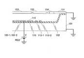 そこで、本参考例では、図7に示すように駆動電極103−1〜103−4の表面の絶縁層111に、帯電防止構造として開口部112を設ける。これは、図3の容量C2と抵抗R2を除去(短絡)することを意味する。
