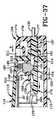 ように付勢するからである。次に店員は、図30、図31の非ラッチおよび非ロック位置から図32および図33の部分的ロック位置へ、クリップ135をスロット開口187に挿入する。ロッキングクリップ173がスロット開口187(図32)を通して挿入されると、ロッキングクリップ173の先細のまたは傾斜した端183は、図31のそれらの下向きに付勢された位置から矢印Bで示されるような図32の持上げられる位置にロッキングプランジャ190を移動させる。ロッキングクリップ173が図32の位置から図33および図34の第1のロック位置まで筐体113の開口187にさらに挿入されると、ロッキングプランジャ190は、第1の対の凹部179の中へばね193によって下向きに付勢される。図37のこの第1のロック位置にあると、ロッキングクリップ173は筐体113から外れないようにされる。The mode of operation of the modified