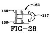 この発明の特徴のうち1つに従うと、解除ボタン169(図22Bおよび図30)は、スプール区画116にピボットピン165によって回動するように搭載される。解除ボタン169はピボットから反対側の端に外向きに突出する爪171を含み、その機能を以下にさらに論じる。この発明の別の特徴に従うと、装着クリップ135(図22A)は、一般的に173で示されるロッキングクリップと、クリップハウジング174とを含む。ケーブル133は、1対の金属フェルール(ferrule)175によってロッキングクリップ173中にしっかり固定された2つのケーブル区間として示される。フェルール175はケーブル133の端に装着され、クリップ173の中に形成されてケーブルをロッキングクリップ173の一方端にしっかり固定する区画167の中に着座する。ケーブル133は、クリップハウジング174の端壁178に形成された細長いスロット177(図27)を通して外向きに延在する。ロッキングクリップ173は一般的に矩形の平面構成を有し、スロット170によって1対の脚部168に分割される。各々の脚部は間隔をあけられた第1の対の凹部179(図22Aおよび図31)を有するように形成され、その各々は直角の肩184と反対側の上向きに延在する先細の後部壁180の中で終端し、また各々の脚部は凹部179から後方に間隔をあけられた第2の対の凹部181を有する。ロッキングクリップ脚部168の前方周縁は、第1の対の凹部179に隣接する先細面183を有する。これらの凹部および角度付き面の機能を、ロック区画118内の装着クリップ135の配置およびロッキングに関して以下にさらに論じる。  According to one of the features of the present invention, the release button 169 (FIGS. 22B and 30) is mounted on the