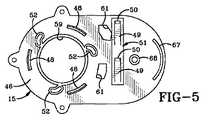 本発明の独自のロッキング機構は、一般的に69で示される、回動するように搭載されたロックアーム(図4B)を含み、ロックアームは、湾曲端71と、対向端72と、介在ピボット73とを含む。端72はアーチ状のラチェット歯74の部分を有するように形成され、端71はそこから下向きに延在する1対のボス75を有するように形成される。ロックアーム69は、ピボット73を形成する開口の中に延びかつロック区画13の中に位置する柱77の上方端上に回動するように装着され、これにより、組立てられると、ラチェットの歯74が、図6に示されるようなロッキングディスク35の端45の底面上に形成されたラチェット歯78のアーチ状セグメントと嵌め合い係合する。ロックアーム69はピボット柱77上に形成された環状の肩70上で静止しかつこれによって支持され、アーチ状突起67と、プレート15の内側面上から延在する環状ボス68(図5および図9)とによって定位置に保持される。ピボット柱77の延在端はボス68内で受けられる。アーム69は壁57(図4B)に沿って形成された1対のリブ62によっても支持される