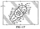 方向に空転する。店員は、矢印Aで示されるように、クリップ19を外向きに引張り、これによりスプール8の周りからケーブル7をほどく。ケーブルは、端スロット開口83の入口にクリップが存在する、図18に示されるような位置にクリップ19が達するまで、パッケージの角の付近に配置される。店員は、クリップ19を矢印Bに示されるように開口83に挿入し、これにより、クリップ19の角度付きスロット80への入口と整列したロックアーム69のボス75が、角度付きスロット80に沿って角度付けられた態様で移動する。この移動によりロックアーム69がピボット73の周りで回動し、これによりアーチ状ラチェット歯78(図7A)と係合しているラチェット歯74がロッキングディスク35を十分に回転させて、湾曲ボス52内での柱41の移動により歯車の歯43をスプールの歯28と係合するように移動させる。この結果、クリップ19、ボス75およびラチェット歯43は、図7に示されるようなロック位置をとるようになる。ロッキングタイン49は自動的に図16のロック解除位置から図10のロック位置に移動して、遠端50は凹部47の中および凹部47の端にある肩54と当接係合する。図7のこのロック位置では、クリップ19は、ロッキングアームボス75および角度付きスロット80の角度付き位置により、筐体5から係合解除されないようになっている。アーム75は、ラチェット歯74とロッキングディスク35のラチェット歯78との係合によりそれ以上移動することがないようにされている。なぜなら、ディスク35は、凹部47と係合するロッキングタイン49およびスプール26の一方向歯車の歯28とロッキング爪歯車の歯との係合によりそれ以上移動しないようにされているからである。ロッキングアーム69は、一方端でクリップ19によってしっかりと固定され、他方端でラチェット歯74によってしっかり固定されているので、移動しないようになっている。このように、ロッキングディスク39の爪の歯43がスプールの歯28としっかりと係合する。スプールの歯28と爪の歯43との係合により、ケーブルをほどく方向または放す方向へのスプールのいかなるさらなる回転も防止される。The mode of operation of the improved cable wrap security system of the present invention is best illustrated in FIGS. In the unlocked unmounted position as shown in FIG. 17, the