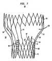 作動状態にある際には、弁は、細長いプローブなどの搬送装置(不図示)上に取り付けられて潰れた状態で運ばれる。この搬送装置は、潰れた状態にあるステント体を保持するようにされたシースを有しているとともに、ステント体に対してシースを動かしてステント体をシースから放出する機器を有している。搬送装置は、弁が自然大動脈弁の位置に達するまで患者内を進入し、その位置にて輪状部12が大動脈の弁輪と隣接する。弁がシースから放出され、ステント体10がそれ自体の弾性によって膨張する。そのステント体10の弾性膨張は、ステント体10が機械的拘束から解放される結果として単独に生じてもよいし、あるいは、ステント体10の材料が温度変化の影響を受ける結果として生じる膨張を含んでいてもよい。ステント体10が潰れた状態から膨張、作動状態へと導かれる膨張は、全体としてステント体自体によってほぼ行われるのが好ましい。言い換えると、ステント体が完全に自己膨張し、如何なる部分の膨張をも引き起こすバルーンや機械的運動装置を必要としないのが望ましい。輪状部12は、自然弁尖の弁輪2に係合するとともに自然弁尖の内面7にも係合する。各係止部材50は、このような自然弁尖の遠位縁部9にて、または遠位縁部9の近傍にて自然弁尖の一つに係合する。各係止部材50の係合ストラット56および近位接合部57は、遠位縁部にて、または遠位縁部の近傍にて自然弁尖の外面8に保持される。弁尖は、説明を容易にするために図5では単純な幾何学的形状に示されているものの、当然のことながら弁尖は典型的には不規則的な形状を呈している。たとえば、弁尖はこぶ状または凹凸状であってもよい。大動脈部20は移行部4にて、または移行部4の近傍にて自然組織に係合する。  When in the actuated state, the valve is carried in a collapsed state mounted on a transport device (not shown) such as an elongated probe. The delivery device has a sheath adapted to hold the stent body in a collapsed state, and has a device that moves the sheath relative to the stent body to release the stent body from the sheath. The delivery device enters the patient until the valve reaches the position of the natural aortic valve, where the