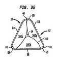 図32の輪状部12を有するステント体が、本発明の更に別の実施形態による弁に組み込まれている。輪状部12は、ステント体の近位遠位軸周りを延びる複数のセルによって形成されたほぼ管状の壁を備えている。自由または非拘束形態では、近位遠位軸線に垂直な図32の平面の断面で見るように、管状壁は、ほぼ三角形の形態を有している。そのため、その壁は、断面形状の側部を形成する側部領域68と、各側部領域を接続させる角部領域69とを有している。断面で見る角部領域は、ほぼ弧状である。弁は、接合自由縁部340を有する3つの人工弁尖300a、300b、300cを備えている。これらの自由縁部は、角部領域69内へ延びる接合部に沿って互いに当接している。たとえば、ステント体は、角部領域69に配置された接合柱40を有していてもよい。  A stent body having the