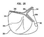 図24は三尖人工弁尖300の平坦、前面図である。点線310は、より精密な組み立て体を可能にする、外科用インクを用いたスクリーン印刷や縫合などの手段によって弁尖上に印が付けられた仮のパターンであってもよい。領域320は、最も遠位の一組の鉛直方向穴120(たとえば図2参照)にステントの接合柱40を介して縫合できる。弁尖自由縁部340より遠位の追加的な弁尖材330は、ステントの接合柱140の水平方向穴130(たとえば図2参照)を介して縫合によって取り付けできる。これにより、高応力領域320に荷重を集中させることなく、弁尖からステント支柱40へ動的荷重を伝達できる。成形弁尖胴体350は、自然弁の形態により自然に似るようにステント波状部と適合する。単なる実施例として、弁尖は牛や豚の心膜などの動物組織から形成されていてもよい。  FIG. 24 is a flat front view of the tricuspid