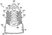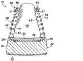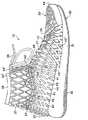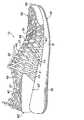 本発明のさらなる局面は、例えば、上記様々な型の履物物品を製造する方法に関する。そのような方法は、例えば、下記を含んでもよい:(a)複数の孔部を規定する1つまたは複数のポリマーマトリクス構造を形成する工程であって、ポリマーマトリクス構造が第1の自由端および第2の自由端を提供する、工程;(b)第1の自由端がアッパーのヒール部位に沿って延在し、第2の自由端がアッパーのヒール部位に沿って延在するように、ポリマーマトリクス構造をアッパーに組み入れる工程;(c)第1の自由端および第2の自由端を係合させる工程;ならびに(d)ソール部材をアッパーに固定する工程。これらの工程は任意の所望の順序で行ってもよい。ポリマーマトリクス構造は、全体のアッパー構造の任意の所望の一部、複数の部分、または割合を形成してもよい。1つまたは複数の追加の要素、構造、および/または特徴、例えば、ヒールタン要素、靴固定機構、インステップタン部材、および/またはブーティ要素を、本発明から逸脱しなければ、全体の履物構造および/または履物製造方法に組み入れてもよい。 A further aspect of the invention relates to, for example, a method of manufacturing the various types of footwear articles described above. Such methods may include, for example: (a) forming one or more polymer matrix structures defining a plurality of pores, wherein the polymer matrix structure is a first free end and Providing a second free end; (b) such that the first free end extends along the heel portion of the upper and the second free end extends along the heel portion of the upper; Incorporating the polymer matrix structure into the upper; (c) engaging the first free end and the second free end; and (d) securing the sole member to the upper. These steps may be performed in any desired order. The polymer matrix structure may form any desired portion, portions, or proportions of the overall upper structure. One or more additional elements, structures, and / or features, such as heel tongue elements, shoe fastening mechanisms, instep tongue members, and / or bootie elements, without departing from the present invention, It may also be incorporated into the footwear manufacturing method.