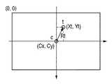 極座標変換回路123は、画素tの水平カウンタ値Xt及び垂直カウンタ値Ytを、光軸位置情報Cx、Cyに基づいて、光軸Cを原点とする極座標系に変換する。極座標は  The polar coordinate