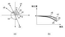 上述したように、複数のレンズを含むレンズユニット1及び絞り2の光学特性は、光学部材の形状や、センサの物理的構造などにより、非点対称となることが多い。図6(a)は、光軸cを中心とした偏角θ1〜θ4の動径方向cf1〜cf4を表し、図6(b)は、図6(a)に示す動径方向cf1〜cf4の像高における適正な光学特性に対する補正量の一例を示したものである。図6に示す例では、光学特性が角度によって異なる非点対称性を持っているものとし、図6(b)に示すように各動径方向Cf1〜Cf4の補正量は互いに一致しない。Therefore, the polar coordinate