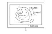 図6に示すように、広帯域画像データに基づいて生成される広帯域画像70には、被写体組織表層の粘膜の状態、組織内の血管、陥没や隆起などの粘膜表面の形状、ポリープの有無といった被写体組織の全体的な様子が映し出されており、この広帯域画像70では、血管領域特定部64によって、第1血管領域71が表層血管領域と、第2血管領域72が深層血管領域と特定される。第1血管領域71は、深層の第2血管領域72と比べて、明瞭に映し出されるため、非常に目立つ。図6において、太線は視認性が高く、細線は視認性が低いことを示している。  As shown in FIG. 6, the broadband image 70 generated based on the broadband image data includes a subject such as the state of the mucous membrane on the surface of the subject tissue, the blood vessels in the tissue, the shape of the mucous membrane surface such as a depression or bulge, and the presence or absence of polyps. The overall state of the tissue is shown. In this wideband image 70, the blood vessel