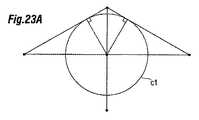 図23Bは、点b1にその中心があり、線分b2−a1およびb2−a2に沿って延在する2つの斜辺まで直角に延在する半径を有する、中心円c1を示す。これを別の方法で見ると、円c1は、両方の線分b2−a1およびb2−a2に接する。次に、図23Cは、同一の側円c2およびc3の作図を示す。側円c2が点a1およびb1を含む一方で、側円c3は、点a2およびb1を含む。したがって、3つの円c1、c2、c3は、各部分に沿って延在する少なくとも1つの半円を伴う4つの同等部に、線分a1−a2を分割する。これを別の方法で記述すると、円c1、c2、c3は、その中心が長軸線分a1−a2に沿って等距離に離間している合同円である。また、2つの外円c2、c3は、それぞれa1およびa2を含み、両方とも中心点b1を含む。 FIG. 23B shows a center circle c1 that has its center at point b1 and has a radius that extends perpendicular to the two hypotenuses extending along line segments b2-a1 and b2-a2. Looking at this in another way, the circle c1 touches both line segments b2-a1 and b2-a2. Next, FIG. 23C shows the drawing of the same side circles c2 and c3. Side circle c2 includes points a1 and b1, while side circle c3 includes points a2 and b1. Thus, the three circles c1, c2, c3 divide the line segment a1-a2 into four equivalent parts with at least one semicircle extending along each part. In other words, the circles c1, c2, and c3 are congruent circles whose centers are spaced equidistant along the long axis segment a1-a2. The two outer circles c2 and c3 include a1 and a2, respectively, and both include the center point b1.