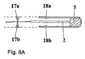 本発明の他の一実施例に依れば、上記繋止手段は、当該第1延長部及び第2延長部の初期位置において本質的に相互に対して接触して阻止部を形成すべく配置された第1延長部及び第2延長部を備えて成る主要部分を備えて成り、上記スライダ、もしくは、該スライダの一部分、又は、上記挿入管、もしくは、該挿入管の一部分は、上記第1延長部及び第2延長部を相互から離間すべく上記繋止手段の上記主要部分内に突出して配置される。 According to another embodiment of the invention, the locking means are arranged to essentially contact each other at the initial position of the first extension and the second extension to form a blocking part. A main portion including a first extension portion and a second extension portion, and the slider, a part of the slider, the insertion tube, or a part of the insertion tube is formed by the first portion. An extension portion and a second extension portion are disposed to project into the main portion of the locking means so as to be separated from each other.
