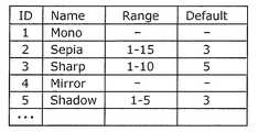 次に、図3Eに示すように、ユーザが継続的なドラッグ操作により、次のコマンドアイコン(ここではColorEdit)が選択された場合(S107のN)には、選択されたコマンドアイコンに応じてS108〜S118のステップが繰り返され、パラメータアイコンの表示が更新される。さらに、図3Fに示すように、操作対象オブジェクトを示すオブジェクトアイコンのドラッグ操作が行われ、オブジェクトアイコンがパラメータアイコン(ここではSepia)上に規定時間以上存在した場合には、図4Fに示されるように、操作履歴テーブルが更新される。 Next, as shown in FIG. 3E, when the next command icon (here, ColorEdit) is selected by the user's continuous drag operation (N in S107), S108 is performed according to the selected command icon. Steps S118 to S118 are repeated, and the parameter icon display is updated. Further, as shown in FIG. 3F, when the object icon indicating the operation target object is dragged and the object icon exists on the parameter icon (Sepia in this case) for a predetermined time or longer, as shown in FIG. 4F. In addition, the operation history table is updated.