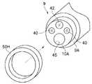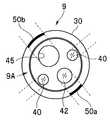 指標50aは、観察窓42の幅と合わせるためのもので、指標50bは、先端開口部45の幅と合わせるためのもので、2つの指標51aは、それぞれ照明窓40の幅と合わせるためのもので、具体的には、先端面9Aを、先端面9Aに直交する方向から見たときに、各指標の中心が、対応する、合わせる窓など部位の中心に最も接近するように、各指標と対応する部位を合わせるように構成されている。  The