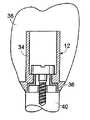 金属的支持体の利点を認識し、ビーティ他(Beaty  et  al.)に対しての米国特許第5,685,714号明細書は、2つの異なった断面を有するアバットメントを記載している。図2に示すように、アバットメント12は、内部またはコア36がチタンまたはチタン合金からでき、外周部またはカフ34はセラミック、一般的にアルミニウム酸化物からできていることを含む。金属コア36は、必要な強さをアバットメントに与え、インプラント40に補綴物38を接続するためフレームワークを提供する。セラミック・カフ34は、好ましくはコア36の全ての外面を囲んで、補綴物38を通して金属コア36の陰影を保護する。PureFormTM(商標)(センターパルス  デンタル社、カールズバッド、カリフォルニア)(Centerpulse  Dental  Inc.,  Carlsbad,  Calif.)は、例えば、アルミナ/ジルコニア混合でできているチタン・コアおよびセラミック・カフから成る歯牙形のアバットメントである。ネジを保つアルミナまたはジルコニアもしくはアルミナ基礎のアバットメントは、商標であるBio―CeraTM(商標)(バイオ−ロック  インターナショナル社、ディアフィールドビーチ、フロリダ)(Bio−Lok  International,  Inc.,  Deerfield  Beach,  Fla.)、CerAdaptTM(商標)(ノーベルバイオケア(商標)社、イェーテボリ、スウェーデン)(Nobel  BiocareTM  AB,  Goteborg,  SE)、および、ZiRealTM(商標)ポスト(インプラント  イノベーションズ社、ウィルミントン、デラウェア)(Implant  Innovations,  Inc.,  Wilmington,  Del.)のもとに利用できる。Recognizing the advantages of metallic supports, US Pat. No. 5,685,714 to Beaty et al. Describes an abutment having two different cross sections. As shown in FIG. 2, the