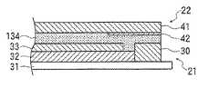 この第2例の製造方法では、光硬化型樹脂組成物として粘度が低く(3000mPa・s未満)、第1例のように表示側パネル21上に光硬化型樹脂組成物を塗布した場合には、図3に示すように、光硬化型樹脂組成物134が隙間37内に流入する樹脂組成物を使用する。図3に示すように、光硬化型樹脂組成物134が隙間37内に流入すると、その光硬化型樹脂組成物134は、バックライト32と画像表示部33の間に浸透し、表示不良が発生するおそれがある。  In the manufacturing method of the second example, when the photocurable resin composition has a low viscosity (less than 3000 mPa · s) and the photocurable resin composition is applied on the