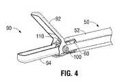 シャフトアセンブリは、ハウジングから延在し、1つ以上の関節運動部材および1つ以上のクランプ締め部材を含む。長手方向軸は、シャフトアセンブリを通して規定される。エンドエフェクタアセンブリは、シャフトアセンブリの遠位端部に配置され、1つ以上のクランプ締め部材の移動に応答して、接近された構成と接近されていない構成との間を旋回可能な1対の対向するジョー部材を含む。1対のジョー部材のうちの1つまたは両方は、1対の対向するジョー部材が接近された構成と接近されていない構成との間を旋回可能であるように、クランプ締め部材の移動が係合部材を旋回させるようにクランプ締め部材に動作するように関連付けられている係合部材を含む。1対の対向するジョー部材は、シャフトアセンブリに対して、シャフトアセンブリの長手方向軸を横断する軸の周りに関節運動する。1対のジョー部材のうちの1つまたは両方は、1対のジョー部材を通るチャネルを規定する。 The shaft assembly extends from the housing and includes one or more articulation members and one or more clamping members. A longitudinal axis is defined through the shaft assembly. An end effector assembly is disposed at the distal end of the shaft assembly and is capable of pivoting between an approached configuration and an unaccessed configuration in response to movement of one or more clamping members. Opposing jaw members. One or both of the pair of jaw members is responsible for the movement of the clamping member so that the pair of opposing jaw members can pivot between an approached configuration and an unclosed configuration. An engagement member is operatively associated with the clamping member to pivot the mating member. A pair of opposing jaw members articulate relative to the shaft assembly about an axis that intersects the longitudinal axis of the shaft assembly. One or both of the pair of jaw members define a channel through the pair of jaw members.