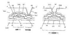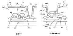本例では、画素電極PX及び対向電極CTとして、例えばいずれも透明導電膜であるITOを用いることができる。また、ソースST及びドレインDTとして、Cr,MoやW及びそれらの合金などn+Si及びITOとのコンタクト性に優れる高融点金属の単層の金属膜を用いることができる。第1及び第2のゲート絶縁膜GI1、GI2、また容量絶縁膜INにはいずれもプラズマCVDにより堆積されたSiN膜を用いることができる。半導体膜ASの表面は図6から図11(あるいは図13、図14)に示したものと同様の工程により、ゲート線駆動TFTの半導体膜ASの表面側の移動度が画素TFTの半導体膜ASの表面側の移動度より大であるように形成される。In this example, ITO, which is a transparent conductive film, can be used as the pixel electrode PX and the counter electrode CT, for example. Further, as the source ST and the drain DT, a single-layer metal film of a refractory metal having excellent contact properties with n + Si and ITO such as Cr, Mo, W, and alloys thereof can be used. Both the first and second gate insulating films GI1 and GI2 and the capacitor insulating film IN can be SiN films deposited by plasma CVD. The surface of the semiconductor film AS is subjected to the same steps as those shown in FIGS. 6 to 11 (or FIGS. 13 and 14), and the mobility on the surface side of the semiconductor film AS of the gate line driving TFT is changed to the semiconductor film AS of the pixel TFT. It is formed so as to be larger than the mobility on the surface side.