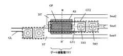 ゲート駆動回路Vは、シフトレジスタSRTと、接続されたゲート線GLに画素TFTをオンとする電圧VGHを印加するためのデュアルゲート型のゲート線駆動TFTを含む。ゲート線駆動TFTは接続されたゲート線が選択された期間、そのゲートGTにオンとなる高電圧が印加される。例えばn番目のゲート線Gnが選択されている期間には、ゲート線Gnに接続されたゲート線駆動TFTにはシフトレジスタのノードSout1から電圧VGH以上の高電圧が印加される。 また、ゲート線Gnが選択されるとゲート線駆動TFTのドレインに接続されたシフトレジスタのノードSout2に高電圧が印加され、ゲート線駆動TFTのソースに電圧VGHが出力される。ゲート線Gnに接続された画素への書き込み後、シフトレジスタのノードSout2は低電圧となり、ゲート線Gnにはゲート線駆動TFTを介しゲート線Gnに接続された画素TFTをオフとする電圧VGLが印加される。次段のゲート線Gn+1が選択されるとSout1には低電圧が印加され、前段のゲート線Gnに接続されたゲート線駆動TFTはオフとなり、次に選択されるまでオフ状態に保持される。また、ゲート線駆動TFTのソースはシフトレジスタのノードSout3に接続されており、Sout3にはゲート線Gnが選択されていない期間、ゲート線Gnに接続されている画素TFTをオフとするための電圧VGLが出力される。他のゲート線についても順次同様の電圧印加が行われる。ゲート線駆動TFTは短時間でゲート線GLに充放電を行う必要があり、大きい駆動力の大サイズのTFTが必要となる。本発明によれば画素TFTのリークを抑えながら、同一の基板SUB1上で半導体膜ASの表面の移動度が大であるデュアルゲート型のTFTを用いることで単位面積あたり約2倍の駆動力のTFTを用いることができ、TFTサイズを従来の約半分に縮小できる。特に移動度の小さいアモルファスSiを用いたTFTによるゲート駆動回路では、ゲート線駆動TFTのサイズが回路幅を左右しており、この部分のTFTを縮小することで回路幅を縮小できる。 The gate drive circuit V includes a shift register SRT and a dual gate type gate line drive TFT for applying a voltage VGH for turning on the pixel TFT to the connected gate line GL. In the gate line driving TFT, a high voltage that is turned on is applied to the gate GT during a period when the connected gate line is selected. For example, during a period when the nth gate line Gn is selected, a high voltage equal to or higher than the voltage VGH is applied from the node Sout1 of the shift register to the gate line driving TFT connected to the gate line Gn. When the gate line Gn is selected, a high voltage is applied to the node Sout2 of the shift register connected to the drain of the gate line driving TFT, and the voltage VGH is output to the source of the gate line driving TFT. After writing to the pixel connected to the gate line Gn, the node Sout2 of the shift register becomes a low voltage, and the voltage VGL for turning off the pixel TFT connected to the gate line Gn via the gate line driving TFT is applied to the gate line Gn. Applied. When the next-stage gate line Gn + 1 is selected, a low voltage is applied to Sout1, and the gate line driving TFT connected to the previous-stage gate line Gn is turned off and held off until the next selection. The The source of the gate line driving TFT is connected to the node Sout3 of the shift register, and a voltage for turning off the pixel TFT connected to the gate line Gn during a period when the gate line Gn is not selected for Sout3. VGL is output. The same voltage is sequentially applied to the other gate lines. The gate line driving TFT needs to charge and discharge the gate line GL in a short time, and a large size TFT having a large driving force is required. According to the present invention, by using a dual gate type TFT in which the mobility of the surface of the semiconductor film AS is large on the same substrate SUB1 while suppressing the leakage of the pixel TFT, the driving force can be about doubled per unit area. TFT can be used, and the TFT size can be reduced to about half of the conventional size. In particular, in a gate drive circuit using TFTs using amorphous Si having low mobility, the size of the gate line drive TFT affects the circuit width, and the circuit width can be reduced by reducing the TFT in this portion.