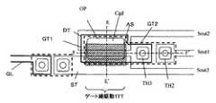 ゲート線駆動TFTにはアモルファスSiからなる半導体膜ASの下部に第1のゲート絶縁膜GI1を介して第1のゲートGT1が形成され、また半導体膜AS及びドレインDTの上部の保護膜PASの開口部OPにおいて第2のゲート絶縁膜GI2を介し第2のゲートGT2が形成されている。半導体膜ASの上部には低移動度層は形成されていない。第2のゲートGT2は対向電極CTとなる透明電極と同層の導電膜で形成され、保護膜PAS及び第2のゲート絶縁膜GI2のスルーホールTH2を介してシフトレジスタSRTのノードSout1に接続される。また、第1のゲートGT1は保護膜PAS、第1及び第2のゲート絶縁膜GI1、GI2に形成されたスルーホールTH3を介して第2のゲートGT2に接続されている。ゲート線駆動TFTのドレインDTはシフトレジスタSRTのノードSout2に接続されている。また、ドレインDTの下部において第1のゲート絶縁膜GI1を介し第1のゲートGT1と、保護膜PASの開口部OPにおいて第2のゲート絶縁膜GI2を介して第2のゲートGT2との間にそれぞれ容量を形成しており、合わせて容量Cdgとして機能する。また、ゲート線駆動TFTのソースはノードSout3に接続されており、同時に第2のゲートGT2と同層の導電膜を介し、ゲート線GLに接続されている。 In the gate line driving TFT, a first gate GT1 is formed below the semiconductor film AS made of amorphous Si via the first gate insulating film GI1, and the opening of the protective film PAS above the semiconductor film AS and the drain DT is formed. In the part OP, a second gate GT2 is formed via the second gate insulating film GI2. The low mobility layer is not formed on the semiconductor film AS. The second gate GT2 is formed of a conductive film in the same layer as the transparent electrode serving as the counter electrode CT, and is connected to the node Sout1 of the shift register SRT through the protective film PAS and the through hole TH2 of the second gate insulating film GI2. The The first gate GT1 is connected to the second gate GT2 through the protective film PAS and the through hole TH3 formed in the first and second gate insulating films GI1 and GI2. The drain DT of the gate line driving TFT is connected to the node Sout2 of the shift register SRT. Also, between the first gate GT1 via the first gate insulating film GI1 below the drain DT and between the second gate GT2 via the second gate insulating film GI2 in the opening OP of the protective film PAS. Capacitors are respectively formed and function as a capacitor Cdg. The source of the gate line driving TFT is connected to the node Sout3, and at the same time, connected to the gate line GL through a conductive film in the same layer as the second gate GT2.