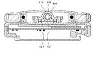 さらに、特許文献4が開示するヒンジ機構は、図11に示すように、回転軸406の外周に平面407を形成すると共に、軸受ホルダー419で回転軸406を支持し、板バネ422で回転軸406を軸受ホルダー419側に押圧している。これにより、板バネ422が平面407に当接した状態と離接した状態とで、回転軸406を回転させるための力に変化が生じて、回転時にクリック感を発生させながら回転軸406の自由回転が規制される。  Further, as shown in FIG. 11, the hinge mechanism disclosed in