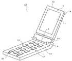 操作筐体13の内部には、各種の情報の送受信等に必要な電子機器が配置されると共に、各種の情報入力に用いられるテンキー等の入力デバイス19が操作筐体13の操作面15に設けられている。操作筐体13における操作面15の先端部(ヒンジユニット14から最も遠い端部領域)には、パッド20が設けられている。  An electronic device necessary for transmission / reception of various types of information is arranged inside the