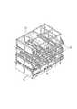 よく知られているように、ロックロッドは、上端及び下端にカム部材が一体的に固着された強度及び剛性の大きい棒材であり、カム部材は、フレームに固定されたカムキーパーと係合してドアを閉鎖する。カム部材は両側に二股部を備え、ロックロッドを回転させることによって、カムキーパーに形成された2個の突起に二股部がそれぞれ嵌め込まれるように構成されている(例えば、特開2000−129980号公報参照)。本発明の建造物では、出入口となる観音開きドアのロックロッドLRが、梁部材4と建造物の底部に置かれた底部フレーム5との間に、いわば補強用柱材として存在することになる。そのため、建造物の強度が増大し、積み重ねた場合でも変形が少なくなる。  As is well known, the lock rod is a bar having high strength and rigidity, with the cam member integrally fixed to the upper end and the lower end, and the cam member is engaged with a cam keeper fixed to the frame. Close the door. The cam member has bifurcated portions on both sides, and is configured such that the bifurcated portions are fitted into two protrusions formed on the cam keeper by rotating the lock rod (for example, Japanese Patent Laid-Open No. 2000-129980). See the official gazette). In the building of the present invention, the lock rod LR of the double door that serves as an entrance / exit exists between the