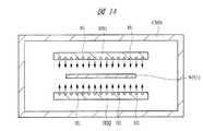 第1の熱処理を行うには、まず、図14に示されるように、窒素ガス(または不活性ガス)雰囲気とされた熱処理用のチャンバCMB内において、一対のヒータブロック(加熱ブロック)HB1,HB2の間に、半導体基板1に対応する半導体ウエハWFを配置する。各ヒータブロックHB1,HB2は、ヒータ(加熱機構)などが内蔵されることで、所望の温度に加熱可能に構成されるとともに、半導体ウエハWFに向かって窒素ガス(または不活性ガス)を噴出(放出)可能な複数の噴出孔(噴出口)H1を有している。図14では、理解を簡単にするために、ヒータブロックHB1,HB2の噴出孔H1から窒素ガス(または不活性ガス)を噴出した場合の窒素ガス(または不活性ガス)の流れを、矢印で模式的に示してある。  In order to perform the first heat treatment, first, as shown in FIG. 14, a pair of heater blocks (heating blocks) HB1, HB2 is provided in a heat treatment chamber CMB in a nitrogen gas (or inert gas) atmosphere. A semiconductor wafer WF corresponding to the