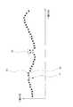 図7は、参照範囲61を1エッジ点間隔で移動させた場合に算出された代表エッジ点を、対応するエッジ点と同一の位置座標軸に表示した例示図である。図7では、各エッジ点63につき、対応する代表エッジ点65が1点ずつ算出されている。欠陥と推定されるエッジ点51、及びエッジ点列52が存在していても、欠陥を包絡することのない近似曲線が求まっていることがわかる。したがって、エッジ点51、及びエッジ点列52の位置を容易に特定することができ、近似曲線との差分によりエッジ点51、及びエッジ点列52における欠陥の大きさを特定することができる。  FIG. 7 is an exemplary diagram in which representative edge points calculated when the