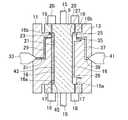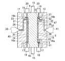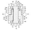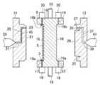 また、キャビティ型9の上方の水平方向中央には、流体圧シリンダ20が各成形面16に対応して1基ずつ配設されている。各流体圧シリンダ20の内側(成形面)側には、補助位置決めピン19が、上記位置決めピン17に対向するキャビティ型9の成形面16bにおける上記周壁部3に対応する長手方向中心位置で突没可能に配設されている。なお、これら位置決めピン17及び補助位置決めピン19の突出長さは上記周壁部3の厚み以上に設定されている。  In addition, one