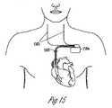 図14〜図15は、迷走神経刺激療法を提供するように構成された医療システムの実施形態を例示し、さらに左右の両迷走神経を刺激できる両側性システムとして例示される。当業者は、本開示を読んで理解することによって、医療システムが、右迷走神経のみを刺激するように設計され得ることと、医療システムが左迷走神経のみを刺激するように設計され得ることと、医療システムが左右の両迷走神経を両側的に刺激するように設計され得ることとを理解するだろう。医療システムは、神経連絡を刺激するか(迷走神経が刺激されると、副交感神経反応を提供する)、神経連絡を阻害するように(迷走神経が阻害されると、交感神経反応を提供する)設計されることが可能である。さまざまな実施形態は、一方向性刺激あるいは神経におけるいくつかの神経線維の選択的刺激を提供する。図14〜図15は、迷走神経の刺激に用いるリードを例示する。無線技術は、リードレス電極が迷走神経を刺激するように構成され、さらに迷走神経刺激療法の制御において用いる植込システムと無線通信するように構成されるように、リードの代わりに用いられ得る。 14-15 illustrate an embodiment of a medical system configured to provide vagus nerve stimulation therapy and are further illustrated as a bilateral system that can stimulate both the left and right vagus nerves. Those skilled in the art can read and understand this disclosure that the medical system can be designed to stimulate only the right vagus nerve and that the medical system can be designed to stimulate only the left vagus nerve. It will be appreciated that the medical system can be designed to stimulate both the left and right vagus nerves bilaterally. The medical system stimulates nerve traffic (provides a parasympathetic response when the vagus nerve is stimulated) or inhibits nerve traffic (provides a sympathetic response when the vagus nerve is inhibited) Can be designed. Various embodiments provide unidirectional stimulation or selective stimulation of several nerve fibers in the nerve. 14 to 15 illustrate leads used for stimulation of the vagus nerve. Wireless technology may be used in place of the lead so that the leadless electrode is configured to stimulate the vagus nerve and further configured to communicate wirelessly with an implantation system used in controlling vagus nerve stimulation therapy.