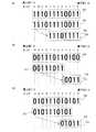 表2における例3、UID値「010111010101」(図15(C)の820)のマスク値「10101」をマスク値比較ルーチンに用いるとき、CPU102は、S614においてUID値の最下位ビットよりポインタ値ビット分(2)以降の値を読み込む。具体的には図15(C)の821で示した「0101110101」を読み込む。次にCPU102は、UIDの読み込んだ値をポインタ値ビット分(2)、即ち2つ右シフトさせる。右シフトの結果、図15(C)の822で示した「0101110101」となる。次にCPU102は、S615においてUIDの読み込んだ値の最下位ビットよりマスク長分(5)の値だけ、比較レジスタ206に格納する。具体的には図15(C)の823で示した「10101」を比較レジスタ206に格納する。最後にCPU102は、比較レジスタ206に格納された値とマスク値とを比較し、一致したときはOUTJUDGEフラグを1に、一致しなかったときは、OUTJUDGEフラグを0にする。具体的には図15(C)の823で示した「10101」とマスク値「10101」とを比較し、一致しているのでOUTJUDGEフラグを1にする。When the mask value “10101” of the UID value “01011010101” (820 in FIG. 15C) is used in the mask value comparison routine in Example 3 in Table 2, the