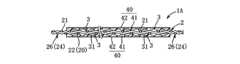 図6に示すように、縦糸21は、例えば、ガラス繊維又は合成樹脂繊維(例えば、ポリエステル、アラミド、ポリエチレン、液晶ポリマーなど)から構成される。本実施例では、縦糸21は、複数本のガラス繊維(例えば、直径0.3mm程度)の束ねた線又は縒り線で構成されている。尚、縦糸21と横糸22にガラス繊維を採用することにより、機械的強度が強く耐熱性に優れた縦糸21と横糸22にすることができる。Next, the