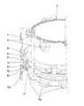 従来、この種の圧縮空気乾燥装置に於ける乾燥容器の取外し機構の技術の一例としては図4に示すWO2007/060882  A1に係る国際公開公報に開示されている。これについて説明すれば、図4は圧縮空気乾燥装置1を示している。圧縮空気乾燥装置1は、例えば大概してコンプレッサの吐出側が接続する入口(図示せず)とメインタンク(図示せず)に接続する出口2と、ガバナー(図示せず)と、ドレンバルブ装置3とを有した例えばアルミニウムやその合金の金属成形品等でなる支持基盤4と、この支持基盤4の例えば上部に、乾燥剤5を充填した乾燥容器6と、この乾燥容器6と、前記アウトレットポート2との間に配置したパージタンク(外側カバー)7とを設けた構成である。該乾燥容器6はその上端周縁に突出部6cを張出し形成している。該突出部6cは所定数個例えば8個周設している。そして該突出部6cの上面に蓋部材6eを取付けボルト6fで固定している。また、該乾燥容器6はその下方に所定数個のパージタンク係止凹陥6dを例えば8個を所定間隔を有して周設している。該パージタンク係止凹陥6dはパージタンク7の下方に所定数例えば8個を所定間隔を有して形成した係止突起7aを係合し該パージタンク7を係止している。Conventionally, an example of a technique for removing a drying container in this type of compressed air drying apparatus is disclosed in International Publication No. WO2007 / 060882 A1 shown in FIG. To explain this, FIG. 4 shows the compressed air drying apparatus 1. The compressed air drying apparatus 1 includes, for example, an inlet (not shown) generally connected to the discharge side of the compressor, an