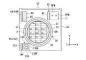 図3は、基板ステージPSTのZステージ52を上方から見た概略平面図である。矩形状のZステージ52の互いに垂直な2つの側面には移動鏡55が配置されており、Zステージ52のほぼ中央には不図示のホルダを介して基板Pが保持されている。基板Pの周囲には、上述したように、基板Pの表面とほぼ同じ高さの平面を有する補助プレート57が設けられている。そして、補助プレート57の周囲には、液体1の回収を行う第2液体回収装置20の一部を構成する液体吸収部材21が設けられている。液体吸収部材21は所定幅を有する環状部材であって、Zステージ52上に環状に形成された溝部(回収口)23に配置されている。液体吸収部材21は、例えば多孔質セラミックス等の多孔性材料により構成されている。あるいは液体吸収部材21の形成材料として多孔性材料であるスポンジを用いても良い。多孔性材料からなる液体吸収部材21は液体1を所定量保持可能である。  FIG. 3 is a schematic plan view of the