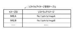 ソフトウェアイメージDB2120は、ソフトウェアイメージ管理テーブル(ソフトウェアイメージ情報。図3参照)を備える。このソフトウェアイメージ管理テーブルは、所定のサービス実行に必要なソフトウェアイメージの種別(イメージID)ごとに、ソフトウェアイメージの格納場所を示した情報である。ソフトウェアイメージは、サービスの提供に必要なソフトウェア構成を含んだファイルであり、サーバ2310に配信されるファイルである。ソフトウェアイメージDB2120は、管理インタフェース部2110等から主KeyであるイメージIDの入力を受け付けると、そのソフトウェアイメージの格納場所を示すパスを返す。パスは、リポジトリ装置2100がアクセス可能な場所であれば、リポジトリ装置2100のローカルディスク上でもよいし、リモートストレージ上でもよい。  The