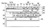 図3に示すように、本実施の形態による保護層42は、アクティブエリアA1に対面する領域においてタッチパネルセンサ層60を覆い、さらに、非アクティブエリアA2に対面する領域までタッチパネルセンサ層60上を延び広がっている。より詳細には、保護層42は、タッチパネルセンサ層60のセンサ部60aを全領域において覆い、さらに、パッド73a,74aの一部分を除き、取り出し部60bも覆っている。すなわち、取り出し部60bは、外部との接続に必要となる取り出し端子として機能する部分を除き、保護層42によって覆われている。  As shown in FIG. 3, the