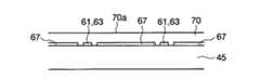 例えば、基材45の一側の面の全面を覆うようにして、高導電率金属からなる膜を蒸着、スパッタ等の真空薄膜形成方法で形成し、フォトリソグラフィー技術を用いてこの高導電率金属からなる膜をパターニングすることによって、第1取り出しライン73および第2取り出しライン74のうちの金属ライン部75aが形成され得る。他の例としては、スクリーン印刷により、所望のパターンで、第1取り出しライン73および第2取り出しライン74のうちの金属ライン部75aを基材45上に形成することもできる。  For example, a film made of a high conductivity metal is formed by a vacuum thin film forming method such as vapor deposition and sputtering so as to cover the entire surface of one side of the