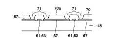 次に、誘電体層70をパターニングする(工程Sa5)。この工程Sa5では、フォトリソグラフィー技術を用いて、誘電体層70をパターニングする。具体的には、図11および図12に示すように、誘電体層70に、誘電体層70と基材45との間に配置された各第2単位センサ主部70に通じる貫通孔71を形成する。この際、上述したように、第2単位センサ66の端をなす第2単位センサ主部67を除く、その他の各第2単位センサ主部67に対応して、当該第2単位センサ主部67に通じる貫通孔71が二つ形成される。また、一つの第2単位センサ主部67に対応して設けられた二つの貫通孔71は、第2方向に離間するようにする。  Next, the