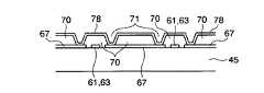 その後、図6および図13に示すように、第2導電体層78を形成する(工程Sa6)。第2導電体層78は、上述した第2単位センサ66のブリッジ部68を形成するようになる層である。したがって、第2導電体層78は、第1導電体層77と同様に、透明な導電性材料を用いて形成される。具体例としては、ITO(酸化インジウムスズ)を蒸着またはスパッタリングにより第1基材45に一側から付着させ、ITOをからなる第2導電体層78を形成することができる。蒸着またはスパッタリングによれば、成膜対象物の表面が凹凸形状として形成されていたとしても、当該凹凸形状に沿って延びる、厚みが薄く且つ一定である膜(層)を形成することができる。したがって、図13に示すように、貫通孔71が形成された誘電体層70の表面、および、貫通孔71によって露出した第2単位センサ主部67の表面に、所望の厚みの第2導電体層78を形成することができる。  Thereafter, as shown in FIGS. 6 and 13, a
