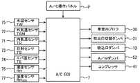 エアコンECU7の内部には、図示しないCPU、ROM、RAM等からなるマイクロコンピータが設けられ、各センサ71〜76からのセンサ信号は、エアコンECU7内の図示しない入力回路によってA/D変換された後にマイクロコンピュータに入力されるように構成されている。  Inside the air conditioner ECU 7, a micro computer including a CPU, a ROM, a RAM, and the like (not shown) is provided, and sensor signals from the