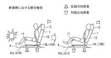 すなわち、図5の左方に示すように、車両が後退している際に、車両後方において衝突が発生した場合、衝突の瞬間において、着座者を含んだ車両シート1に対し後方への加速度が発生し、これにより、車両シート1において、図5における時計回りのモーメントが発生する。したがって、シートクッション11の下端後縁において所定値以上の圧縮方向荷重が発生し、一方、シートクッション11の下端前縁において所定値以上の引張方向荷重が発生する。As shown in FIG. 5, when a collision occurs at the rear of the vehicle while the vehicle is moving backward, the front and rear positions at which the respective loads are generated are opposite to the case of the front collision described above.