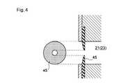 なお、図4に示すように、外套管15の基端部における案内孔21及び連通孔23には、内視鏡11等の挿入器具や湾曲シース部17の挿入時に、管路内外への空気の流出入を防ぐ薄肉ゴム等の弁体45をそれぞれ設けてある。この弁体45により、挿入先の体腔内の気腹圧等の変化が防止される。  As shown in FIG. 4, the