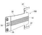 温度均等化プレート15は冷却気体の風路上に配置され、その流れを阻害する邪魔板として機能する。温度均等化プレート15は、図12、図13の斜視図に示すように、プレート本体32を等脚台形状に形成される。またプレート本体32の幅広側の中央には係止爪33が、幅狭側の両側には固定突起37が、それぞれ設けられる。この温度均等化プレート15を図10、図11に示すように電池ブロック3の側面に装着することで、各電池セル1の冷却隙間4の開口面積を、電池セル1積層方向に従って連続的に変化させることができる。  The
