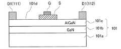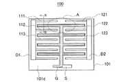 図9に示すように、双方向スイッチ素子100の基板101は、導体層101aと、導体層101aの上に積層されたGaN層2b及びAlGaN層010cで構成されている。この実施形態では、チャネル層としてAlGaN/GaNヘテロ界面に生じる2次元電子ガス層を利用している。図7に示すように、基板101の表面101dには、直流電源2及び負荷3に対してそれぞれ直列に接続された第1電極D1及び第2電極D2と、第1電極D1の電位及び第2電極D2の電位に対して中間電位となる中間電位部Sが形成されている。さらに、中間電位部Sの上には、制御電極(ゲート)Gが積層形成されている。制御電極Gとして、例えばショットキ電極を用いる。第1電極D1及び第2電極D2は、それぞれ互いに平行に配列された複数の電極部111,112,113・・・及び121,122,123・・・を有する櫛歯状であり、櫛歯状に配列された電極部同士が互いに対向するように配置されている。中間電位部S及び制御電極Gは、櫛歯状に配列された電極部111,112,113・・・及び121,122,123・・・の間にそれぞれ配置されており、電極部の間に形成される空間の平面形状に相似した形状(略魚背骨状)を有している。  As shown in FIG. 9, the