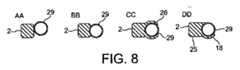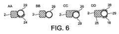 図6は、図5の挿入部の切断線A−A、B−B、C−CおよびD−Dに沿った一連の断面図を含む。この配置では、近位上部チューブ案内部材の上面は、細長い部材の上面と実質的に同一直線上にあり(A−A)、気管内チューブ(径が12.3mm)は、隣接する細長い部材の上面より上方に延在する上面を有している(C−C)。遠位上部チューブ案内部材と同じ高さで(D−D)、下位チューブ案内部材の下面は、細長い部材の下面よりさらに下方向に延在している。さらに、遠位上部チューブ案内部材と同じ高さで、遠位上部チューブ案内部材の上面は、細長い部材の上面よりさらに上方向に延在している。 FIG. 6 includes a series of cross-sectional views along section lines AA, BB, CC and DD of the insert of FIG. In this arrangement, the upper surface of the proximal upper tube guide member is substantially collinear with the upper surface of the elongate member (AA), and the endotracheal tube (12.3 mm in diameter) is adjacent to the adjacent elongate member. It has an upper surface that extends above the upper surface (CC). At the same height as the distal upper tube guide member (DD), the lower surface of the lower tube guide member extends further downward than the lower surface of the elongated member. Further, at the same height as the distal upper tube guide member, the upper surface of the distal upper tube guide member extends further upward than the upper surface of the elongated member.